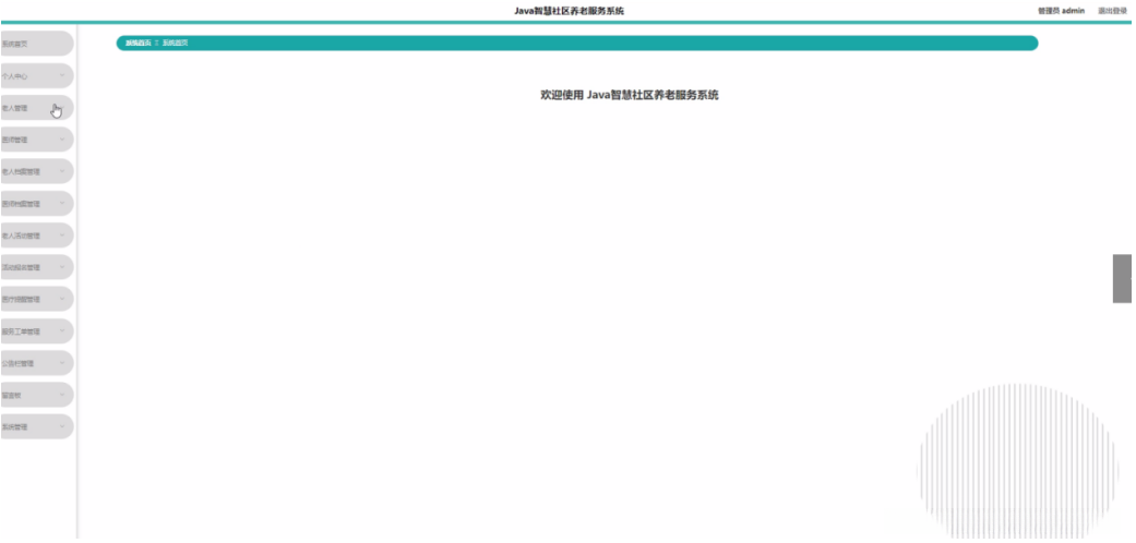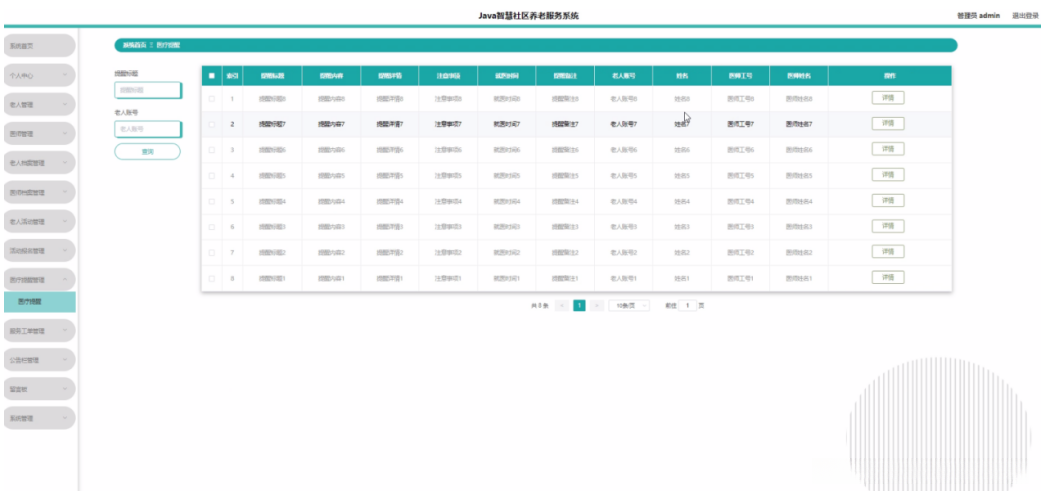 管理员登录进入智慧社区养老服务系统可以查看系统首页、个人中心、老人管理、医师管理、老人档案管理、医师档案管理、老人活动管理、活动报名管理、医疗提醒管理、服务工单管理、公告栏管理、留言板、系统管理等信息,进行相应操作,如图5-8所示。