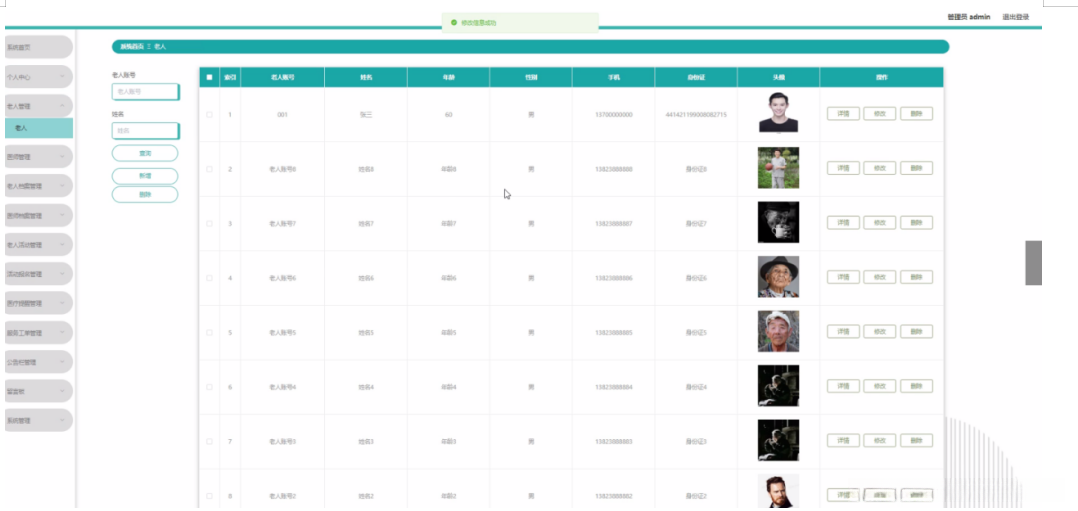 管理员点击老人管理,在老人管理页面的输入老人账号、姓名、年龄、性别、手机、身份证、头像等内容,进行查询、新增或者删除老人信息等操作,如图5-9所示。