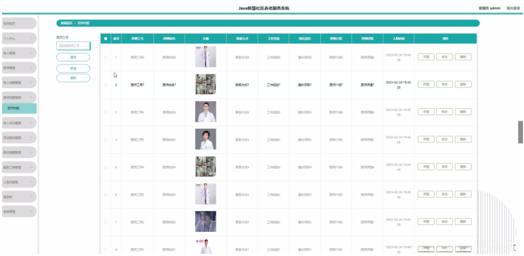 管理员点击医师档案管理,在医师档案管理页面的对医师工号、医师姓名、头像、联系方式、工作经验、擅长项目、医师介绍、医师详情、入职时间等内容,进行查询、新增或者删除医师档案等操作,如图5-12所示。