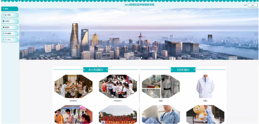 当游客打开系统的网址后,首先看到的就是首页界面。在这里,游客能够看到智慧社区养老服务系统的导航条显示首页、老人活动、公告栏、留言板、后台管理、个人中心等,如图5-1所示。