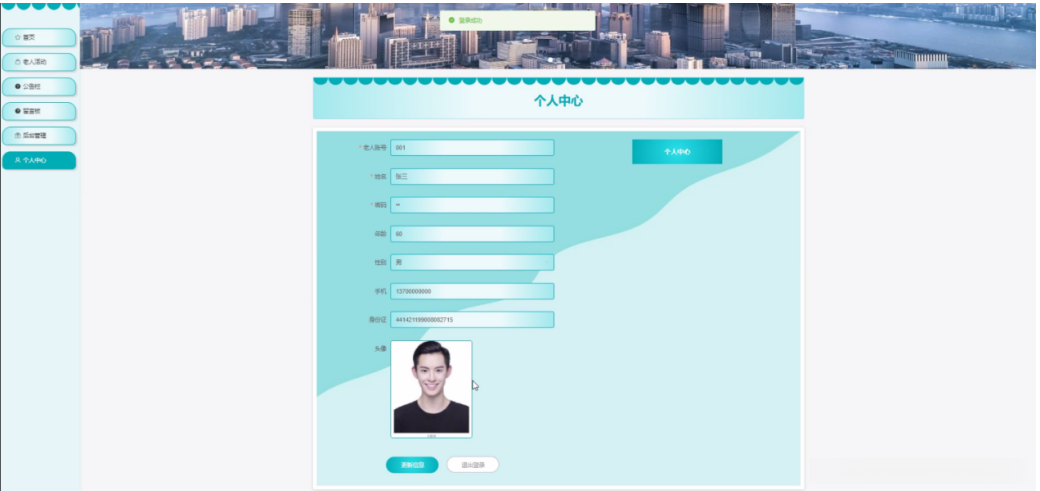 老人点击个人中心,在个人中心页面可以修改个人信息、密码修改进行详细操作,如图5-6所示。