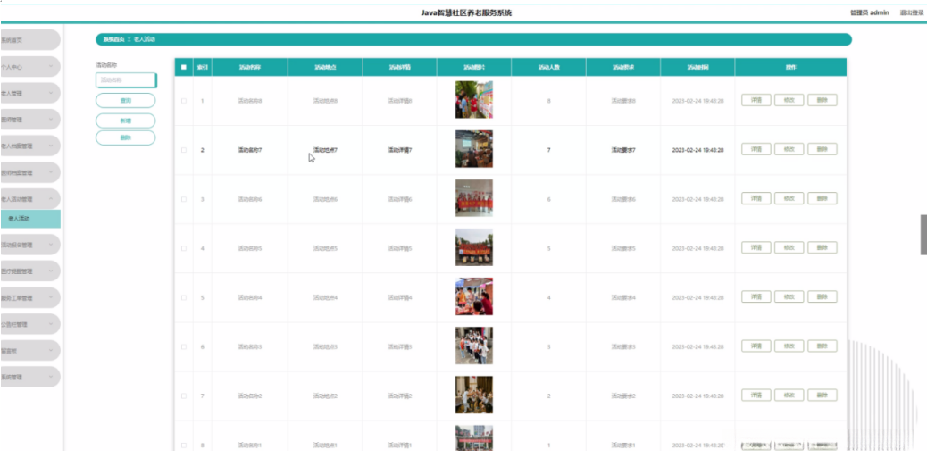 管理员点击老人活动管理,在老人活动管理页面的对活动名称、活动地点、活动详情、活动图片、活动人数、活动要求、活动时间等内容,进行查询、新增或者删除老人活动等操作,如图5-13所示。