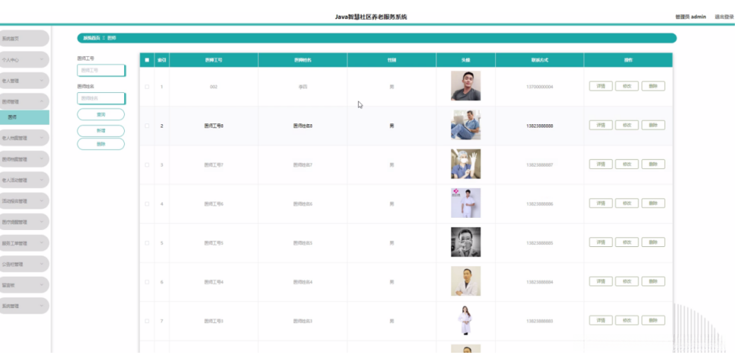 管理员点击医师管理,在医师管理页面的输入医师工号、医师姓名、性别、头像、联系方式等内容,进行查询、新增或者删除医师信息等操作,如图5-10所示。