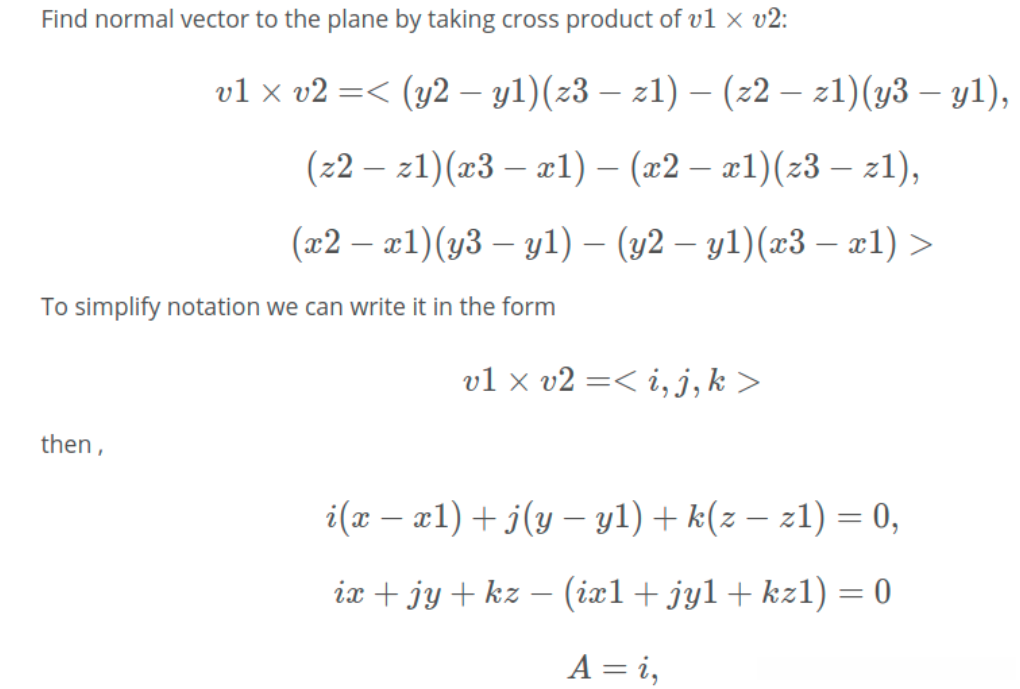 a = (y2 - y1) * (z3 - z1) - (z2 - z1) * (y3 - y1);