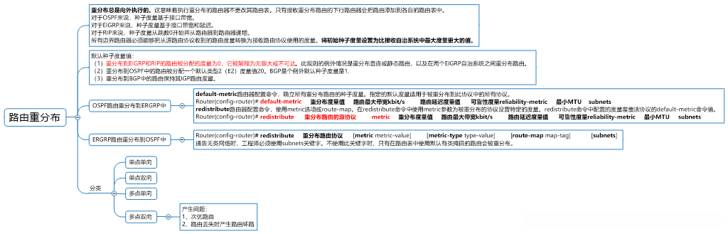 Router(config-router)# redistribute 重分布路由的源协议 metric 重分布度量值 路由最大带宽kbit/s 路由延迟度量值 可靠性度量reliability-metric 最小MTU subnets