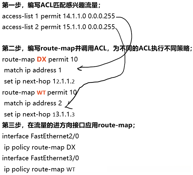 基于策略的路由(PBR) :使用route-map来匹配源和目的地址、协议类型和终端用户应用。当找到匹配项时,set命令会指定应该把数据包发送到哪个接口或哪个下一跳地址。使用PBR能够定义路由策略,而不是使用基于目的的路由。需要使用ip policy route-map接口配置命令在接口上调用route-map。