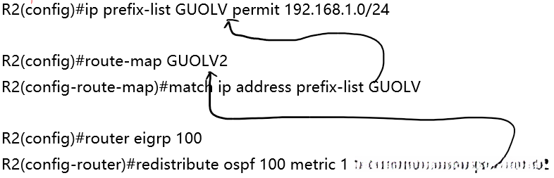 Router (config-router) # distribute-list prefix-list 列表名称或编号 out或in 接口或路由进程或自治系统号