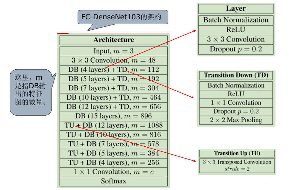 在FC-DenseNet右侧使用Dense block和transition up替换FC上采样的卷积操作。Transition up 使用转置卷积上采样特征图,与跳层传来的特征串联,生成新的dense block的输入。