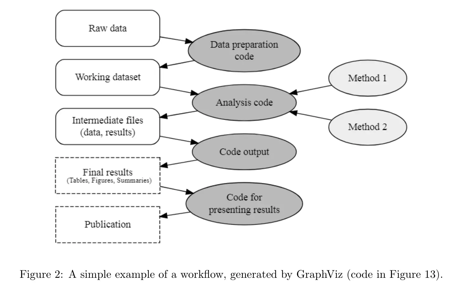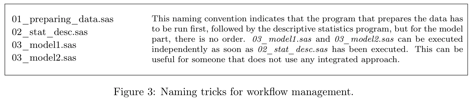 管理工作流程有多种方法。一个解决方案是记录整个工作流程并生成一个图表,如图 2 所示。存在不同的工具来创建、管理和图形化地可视化工作流。另一个想法是使用命名约定。例如,Chuang 等人 (2015) 建议在程序名称前放置一个数字,指示执行顺序,如图 3 (改成代码样子) 所示。这就是 Long (2009) 所说的“运行顺序规则”。