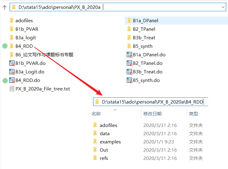 - 每个计量专题对应一个 dofile 和一个同名的文件夹,如「B4_RDD.do」与【B4_RDD】对应,而后者有进一步包含五个子文件夹,以便分类存储数据、参考文献和输出结果等不同类型的文件。