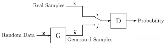 生成器 G 接收隐空间中的随机向量作为输入,并通过深度学习网络架构产生与真实数据相似的样本。鉴别器 D 接收来自训练数据集的真数据样本以及由 G 生成的假数据样本,并评估这些输入是否来自于真实训练集的概率分布。当输入的实际训练样本时返回 1;当输入生成的数据时返回 0。