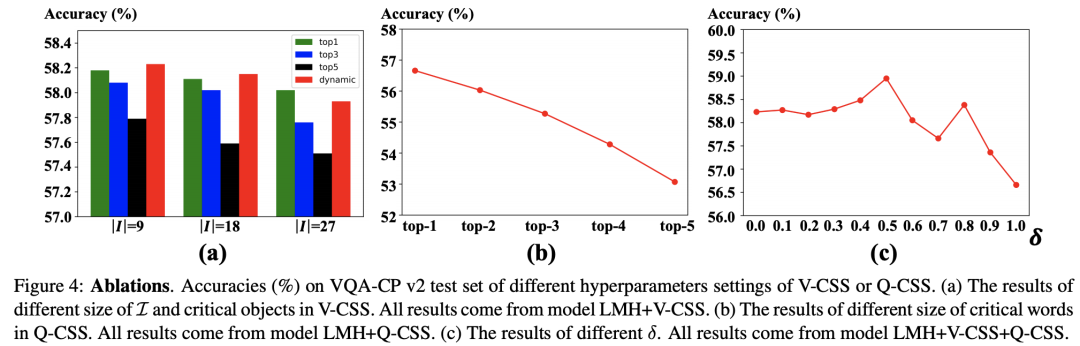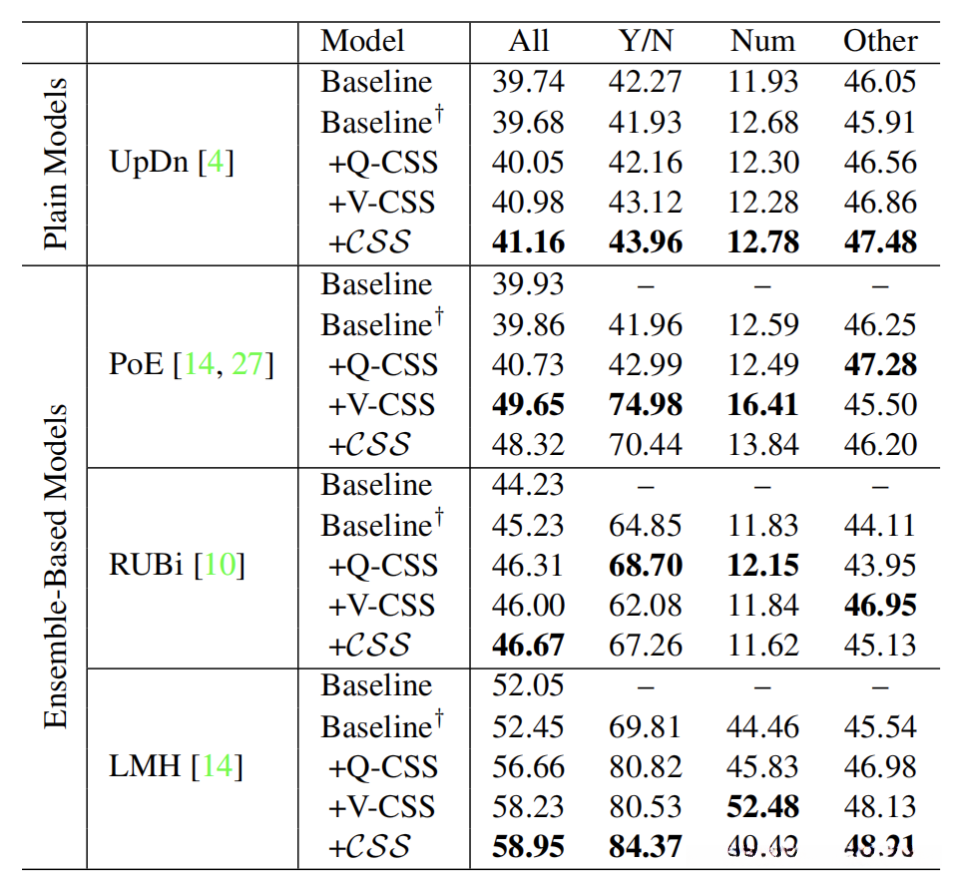 在VQA-CP v2测试集上,多个模型添加本文方法得到的提升如下图所示。其中,Baseline是原文中的结果,Baseline+是本文作者重现的结果。