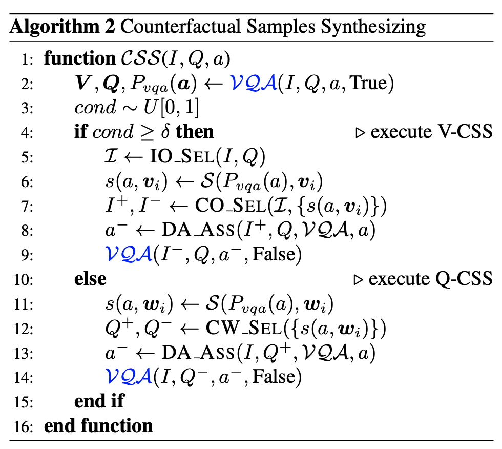 本文提出的是一个通用的方法,可以和现有的VQA方法进行融合,通过在训练过程中对数据进行mask,提高模型的效果。对于每个训练样本(I,Q,a),具体的训练步骤如下所示: