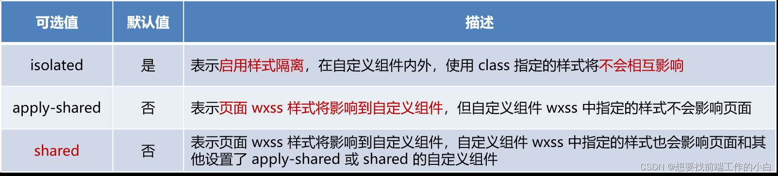 默认情况下,自定义组件的样式隔离特性能够防止组件内外样式互相干扰的问题。但有时,我们希望在外界能够控制组件内部的样式,此时,可以通过 styleIsolation 修改组件的样式隔离选项,用法如下: