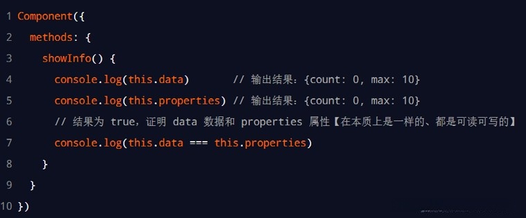 由于 data 数据和 properties 属性在本质上没有任何区别,因此 properties 属性的值也可以用于页面渲染,或使用 setData 为 properties 中的属性重新赋值,示例代码如下: