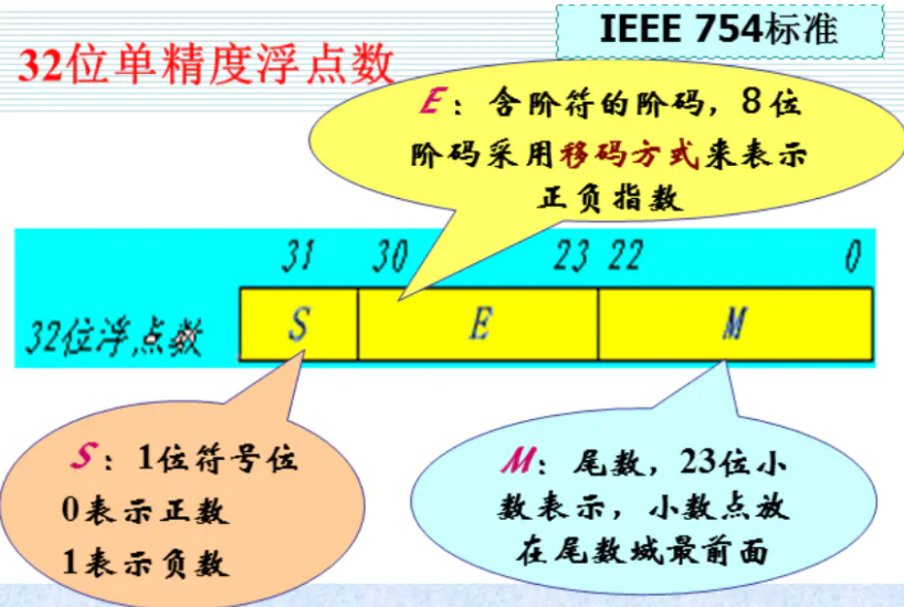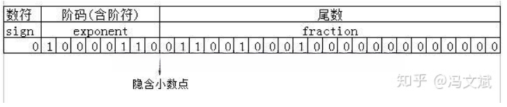 对于32位的单精度浮点型数据来说,在二进制表示中它由三部分组成:符号占用了1位、指数部分占据了8位、而有效数字则占据了剩余的23位。