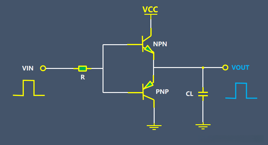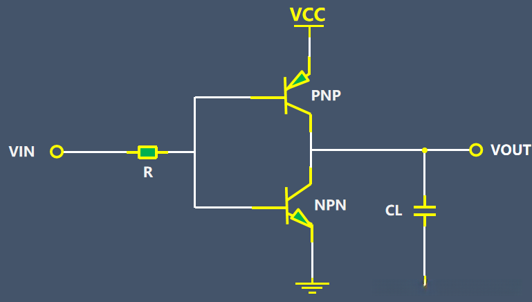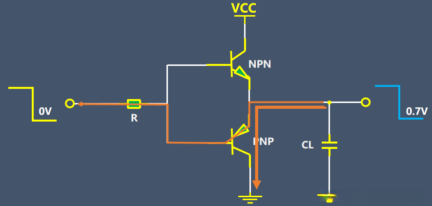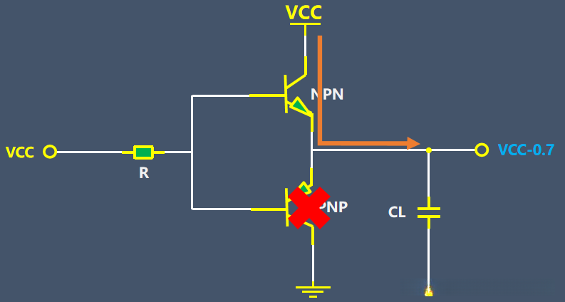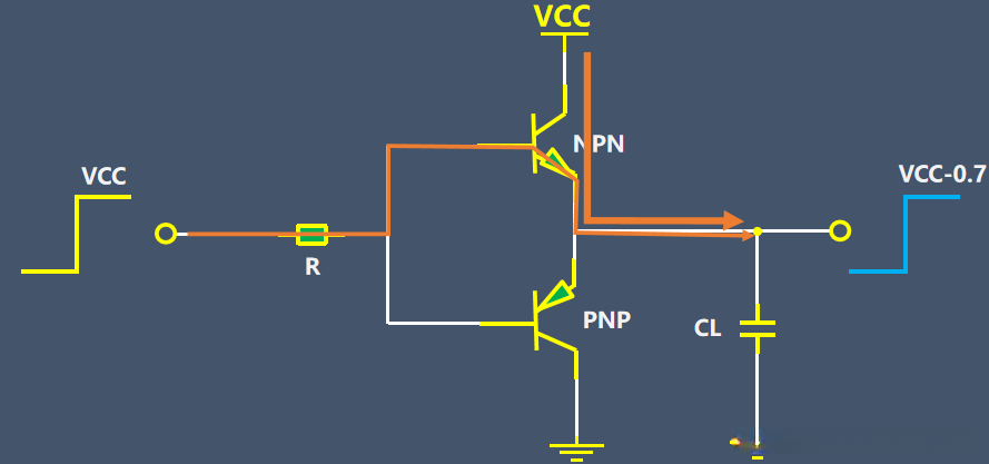 当输入信号为VCC时,上面的三极管导通,下面的三极管截止,输出信号为VCC-0.7V,这个0.7V就是上面NPN三极管BE间的导通压降