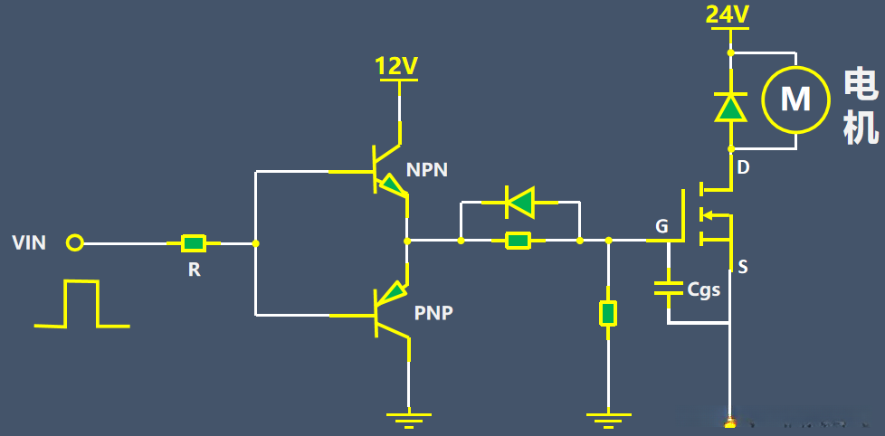 比如这个这个电机驱动电路,其中的MOS管由于栅极到源极间电容瞬时充放电电流比较大,如果需要对Cgs进行快速充放电,一般前级加三极管推挽电路进行驱动,可以有效的降低MOS管的开关损耗。