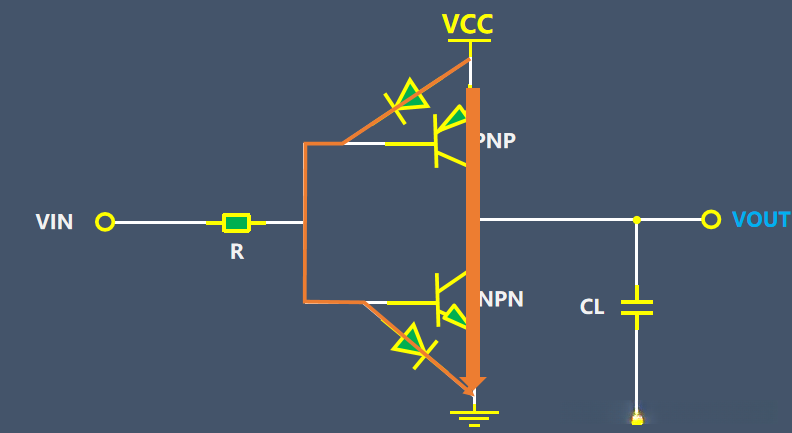 那么大家再来看下这个电路。当没有信号输入时,电源通过PNP三极管EB间的二极管,然后通过NPN三极管BE间而二极管到地,这时这两个三极管都是导通的,三极管很容易由于电流过大而损坏。
