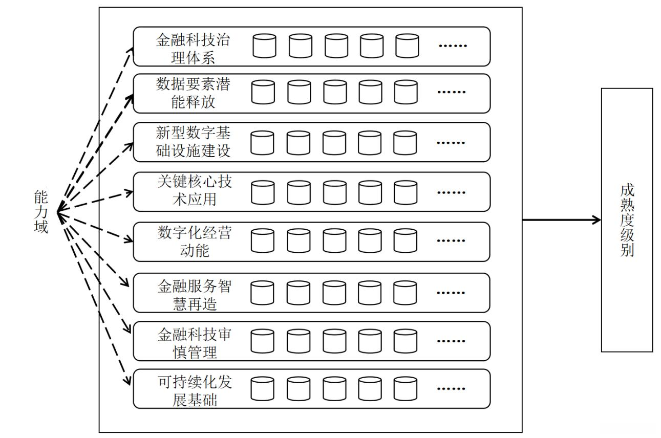 数字化能力成熟度模型架构以金融科技治理体系、数据要素潜能释放等 8 个能力域为核心。每个能力域 由若干能力子域构成,每个能力子域由若干能力项构成。通过对能力项、能力子域得分进行计算后可形成各能 力域的成熟度,进而可得到整体成熟度级别,数字化能力成熟度模型架构如下图所示。