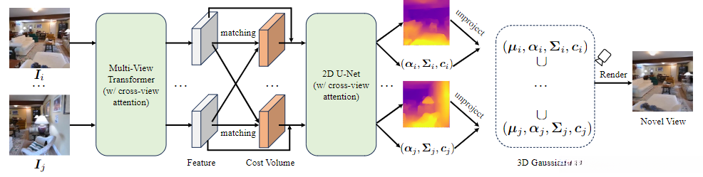 特征提取: MVSplat 主要依据 Transformer 模型从输入的多视图图像中提取特征