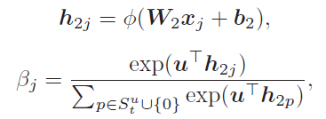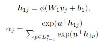 包含long-term preference,而且,相同item对不同user的影响也是不同的。所以以user u作为context vector,采用attention机制计算item j对user 的重要性(权重),权重的计算公式如下:
