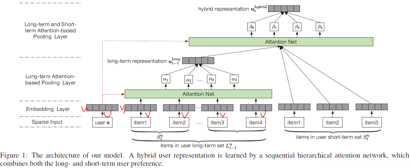 Long- and Short-term Attention-based Pooling Layer: 在得到 long-term preference基础上,同样采用attentin机制结合long-term preference和short-term preference得到user hybrid representation。attention机制能够为user自动选择Long- and Short-term Preference的影响(权重)。计算方法同long-term preference。