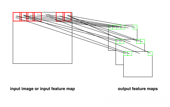如图3所示,输出的特征图中的每一个神经元 (绿色小框),都指向输入图像的唯一的一个滤波区域(红色小框)。人懒,只画出了第一行。