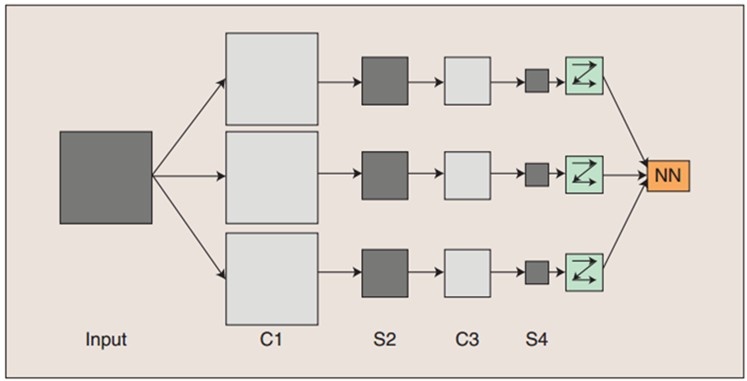 图像输入网络后,通过三个滤波器(filter) 进行卷积,得到C1层的三个特征图(feature map)。C1层的三个特征图分别通过下采样得到S2层的三个特征图。这三个特征图通过一个滤波器卷积得到C3层的三个特征图,然后和前面类似,下采样得到S4层的三个特征图。最后,S4层的特征图光柵化后,变成向量。这个向量输入到传统的全连接神经网络(fully connected networks)中进行进一步的分类。