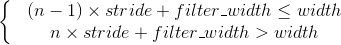 推导过程很简单,主要思想就是最右/下面的一个可放置滤波器的地方,就是最右/下面的滤波区域的右/下边界,不超过输入图像的width/height。列出下面两组不等式,解之即可得到 (1)。