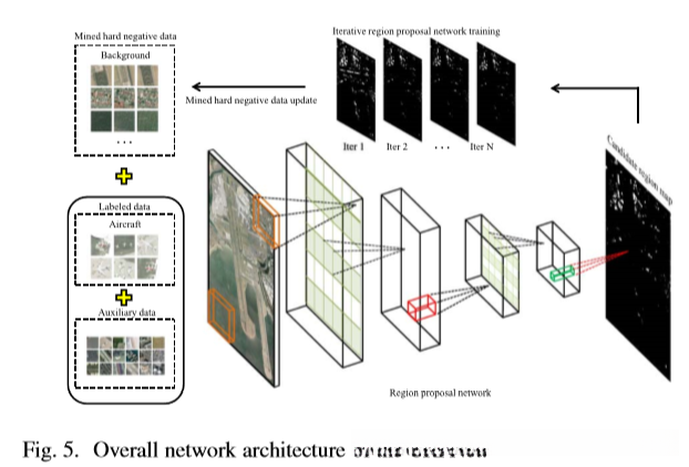对于给定的高分辨率遥感(VHR)图像,在其中标注飞机作为正例,并以辅助数据中的具有代表性的背景区域作为负例进行训练。在每次迭代阶段中,在原始图像上生成候选区域图的同时也会自动筛选出具有代表性的背景区域作为负例,并不断更新训练所用样例集合。具体而言,在迭代过程中系统会自动收集背景类别中的高分候选区域(即可能性超过0.5),并将其归类为难例加入到负例集合中进行处理;而这些被识别为具有代表性的难例并被纳入到负样本集合中以便后续训练使用
