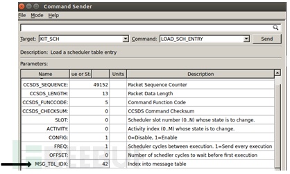 上文已详细阐述了解题思路。借助COSMOS平台,在指令发送界面中,“当Target设置为KIT_SCH时”,存在一条名为LOAD_SCH_ENTRY的指令(如图6-12所示)。将该参数设置为位于KIT_SCH的消息表cpu1_kit_sch_msg_tbl.json中找到的KIT_TO_SEND_FLAG_MID(其值为42),然后单击Send按钮即可完成操作。