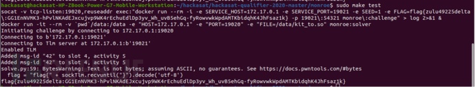 为了模仿主办方设置本挑战题环境的需求,在宿主机上执行以下指令序列:其中IP地址需根据具体情况做相应调整;这些指令的主要目标是启动一个容器,并在其内部部署monroe挑战题服务端。