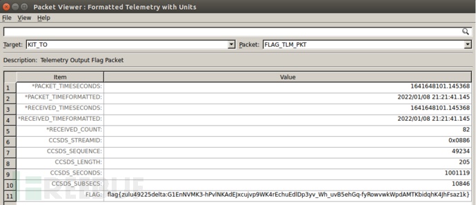 文章指出必须首先启动遥测功能。为此,在COSMOS主界面上需点击Command Sender按钮。这将引导至指令发送对话框,请从Target下拉菜单中选择KIT_TO选项。随后,在Command下拉列表中将出现ENABLE_TELEMETRY选项,并被激活以完成配置过程(如图6-8所示)。接着请单击Send按钮并执行此指令;很快接收到了遥测数据包(如图6-9所示),从而实现了卫星的遥测功能。接下来如何进行操作才能获取flag值?