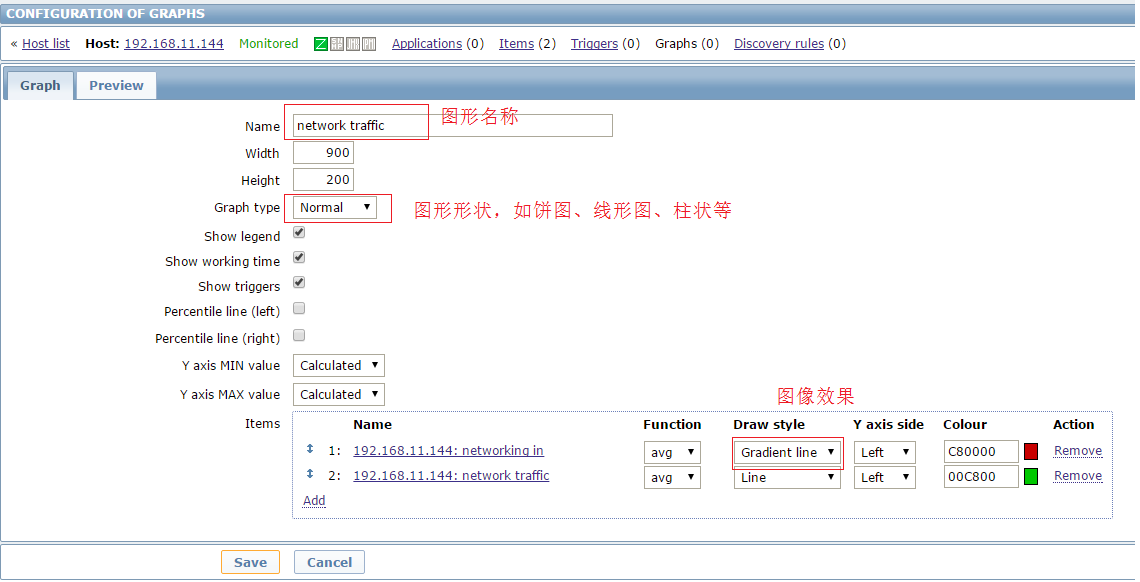 3.创建图形展示数据,点击Graphs,再点create graphs就可以创建图形展示数据了,填上相关的参数: