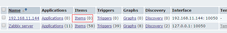 2.再创建一个监控项item,点击上图中的Item项,再点击右上角的create item就可以创建item项了,这里我们添加两个做为测试,一个是eth0的数据流出量和流入量