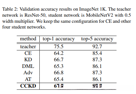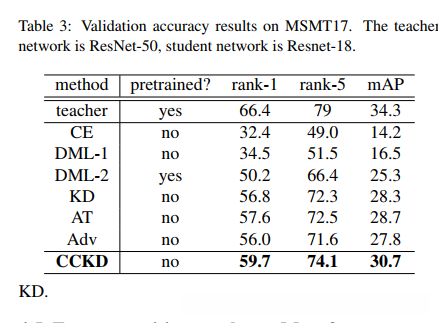On CIFar-100, ImageNet-1K and MSMT17, Original Knowledge distillation (KD) [15] and cross-entropy (CE) are chosen as the baselines. For face recognition, ArcFace loss [5] and L 2-mimic loss [21, 23] are adopt. We compare CCKD with several state-of-the-art distillation related methods, including attention transfer (AT) [37], deel mutual learning (DML) [39] and conditional adversarial network (Adv) [35]. For attention transfer, we add it for last two blocks as suggested in [37]. For adversarial training, the discriminator consists of FC(128 × 64) + BN + ReLU + FC (64 × 2) + Sigmoid activation layers, and we adopt BinaryCrossEntropy loss to train it.