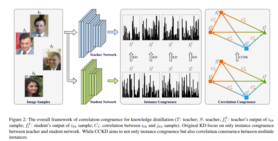 - 提出相关一致性知识蒸馏(CCKD),它不仅关注实例一致性,而且关注相关一致性。(instance congruence通过mini-batch的PK或聚类实现。correlation congruence通过样本I,J直接的相关性损失函数的约束实现实现。)