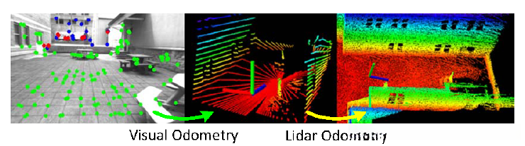 通过激光点云的帮助,视觉里程计注册并且维护了一个深度地图depth map,用以估计运动。
