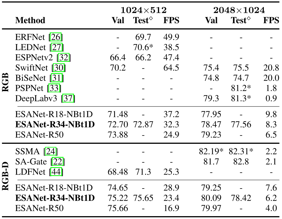 表2:相较于当前最先进的方法,我们的ESANet在两个典型分辨率下的城市景观平均交集与联合均表现优异。据实验数据显示,该框架运行在NVIDIA Jetson AGX Xavier平台(基于Jetpack 4.0.0版本,结合TensorRT 7.1.0及float16混合精度)上具有高效的性能表现。图例中的?号代表测试服务器所得结果,而*号则表示模型通过额外的粗略数据进行了训练以获得更好的收敛效果。