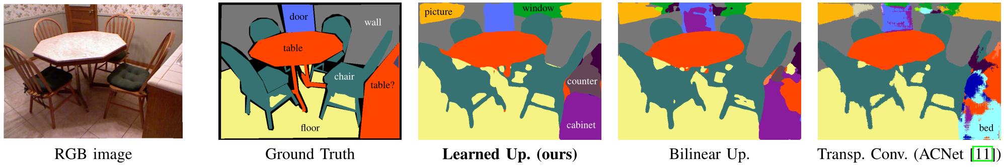 深绿色表明了解码器中采用的不同上采样方法。尽管优化上采样过程会增加推理时间,在这种情况下学习上采样使mIoU提升为0.9。值得注意的是,在图3中展示了与双线性插值相比,在生成分割时采用了更为精细的方法可以获得更多细节信息。这种方法不仅进一步防止了由于转置卷积所带来的问题(如ACNet[11]和RedNet[10]所遇到的问题)。
