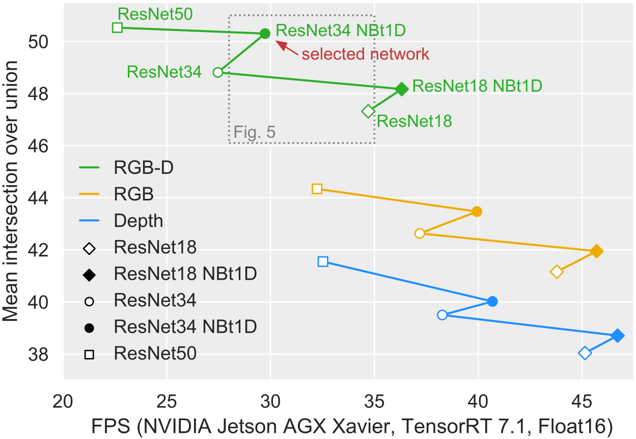 | ESANet-R34-NBt1D | 2×R34 NBt1D | 50.30 | 48.17 | 29.7 |