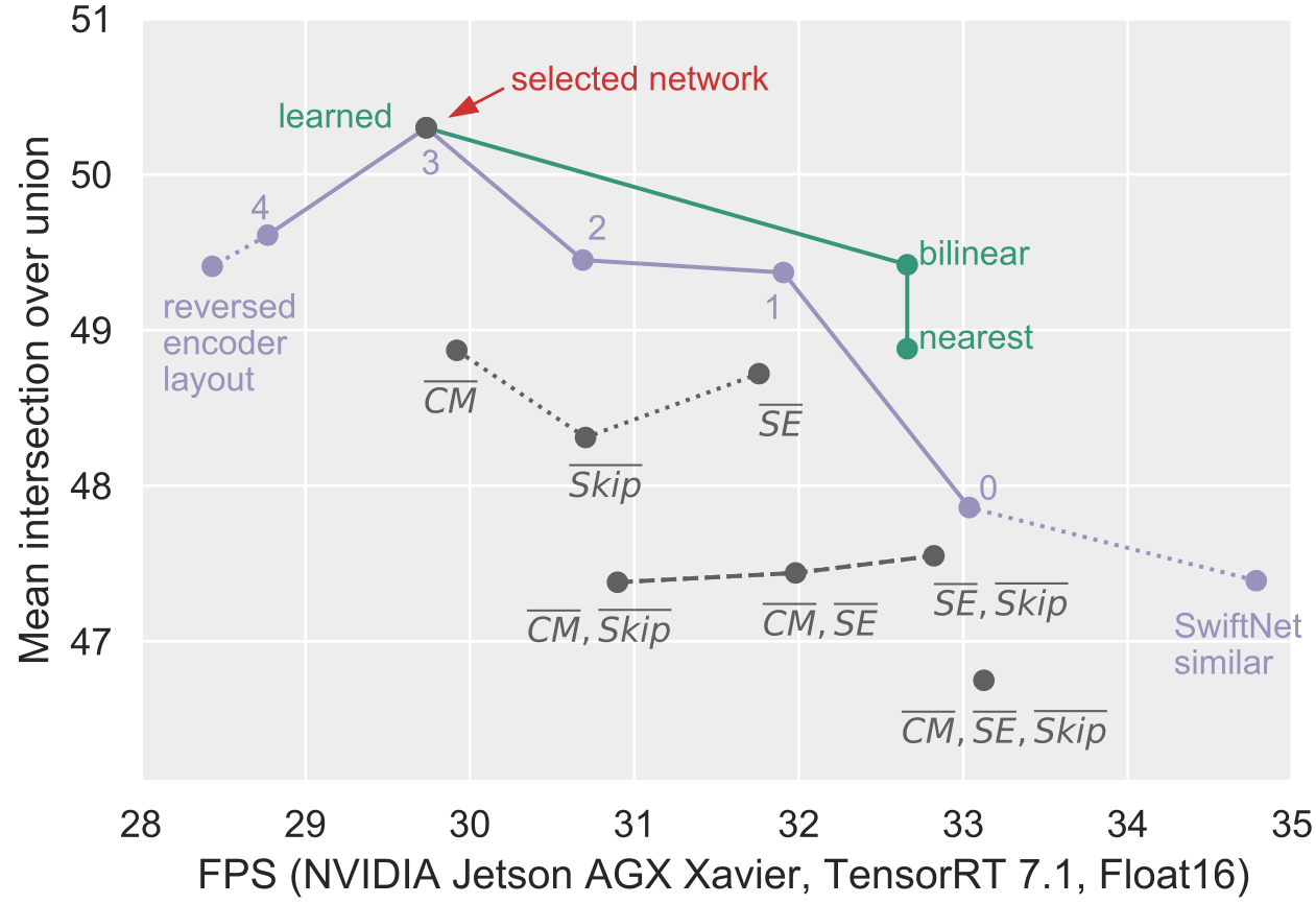 从图中可见,在类似SwiftNet[30]的研究中使用了较简单的浅层解码器效果不佳。因此,在各解码器模块内逐步增加了附加NBt1D结构的数量以提升性能。实验结果表明,在各解码器模块内采用固定数量的三个NBt1D结构能够显著提升性能。
