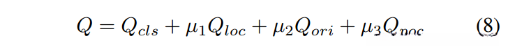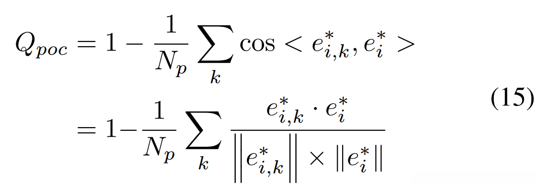 为了衡量自适应点的质量,在研究这一问题时,默认使用一种质量度量指标 Q。基于四个关键指标——分类能力(即 Q_{\text{cls}})、定位精度(即 Q_{\text{loc}})、方向对齐程度(即 Q_{\text{ori}})以及各方向上对应点的相关性(即 Q_{\text{poc}}),我们可以系统地评估一个学习所得的自适应点集。具体推导过程如下: