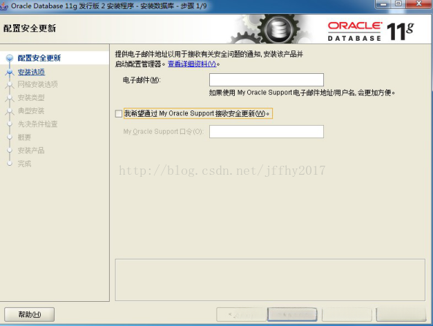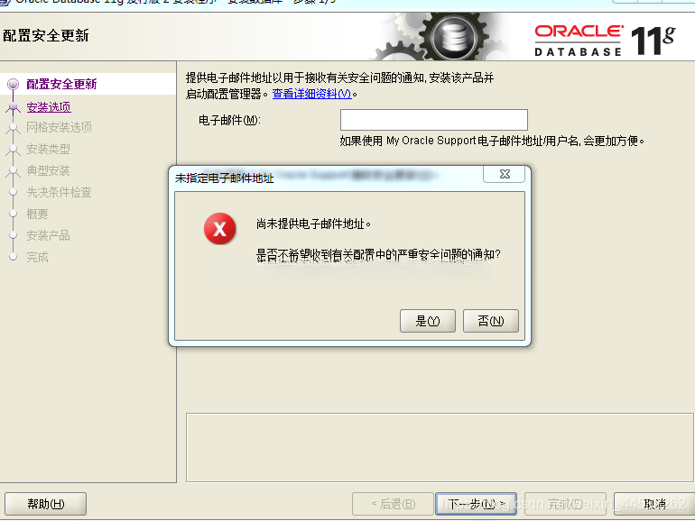 在打开的安全更新配置界面中,在'配置安全更新'窗口中移除'我希望通过My Oracle Support接受安全更新'选项后,请点击'下一步'。