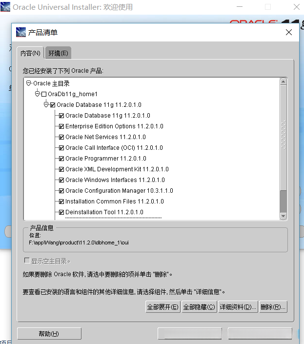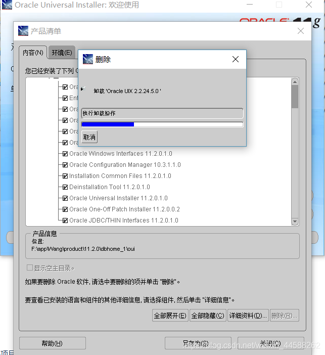 展开所有项目选项后取消选中 Oracle Database 11g Home 1 ,勾选其余项目后点击‘删除’按钮。
