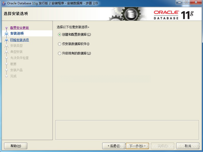 4、在“安装选项”窗口中,选择“创建和配置数据库”,单击“下一步”:
