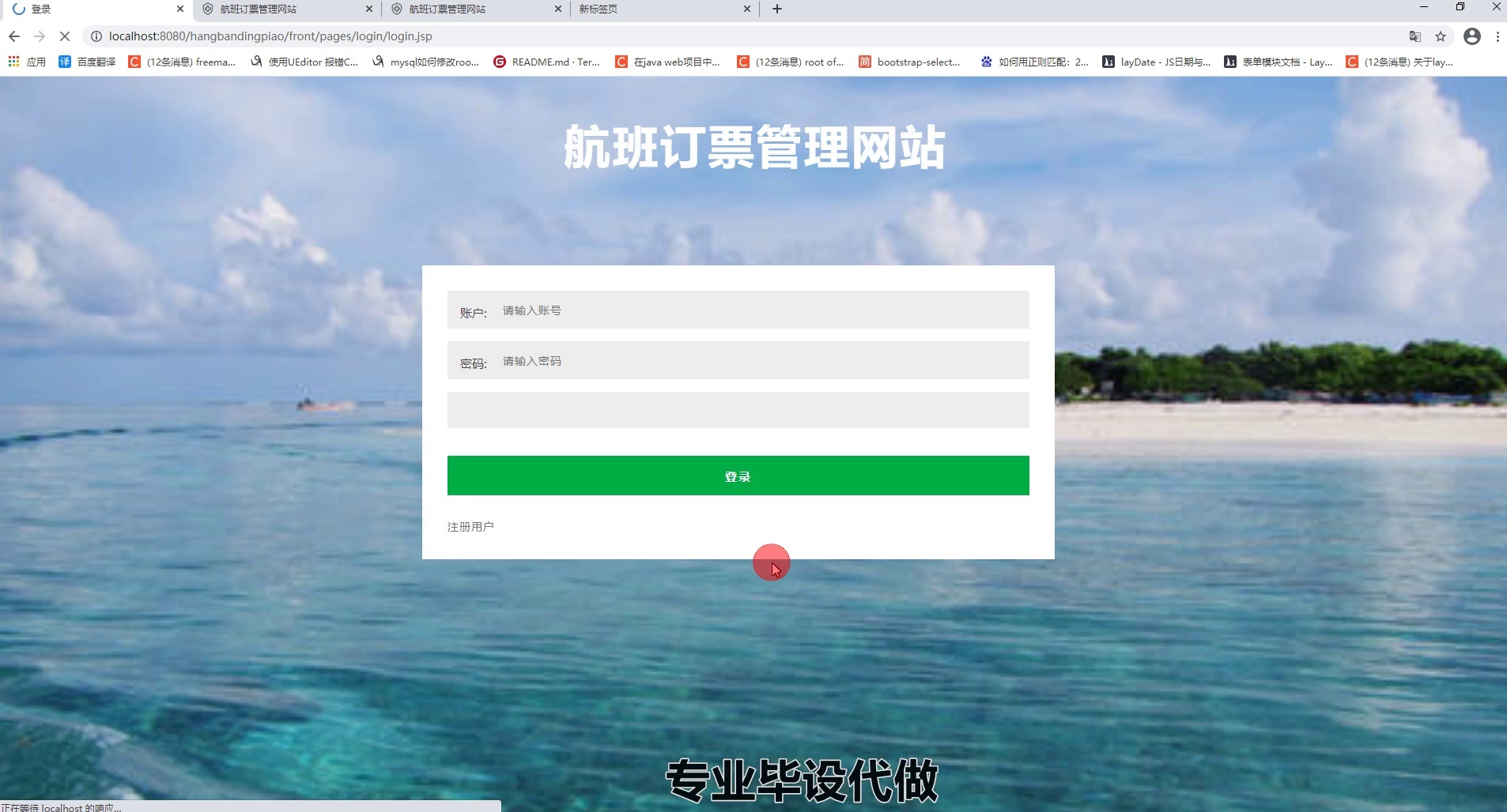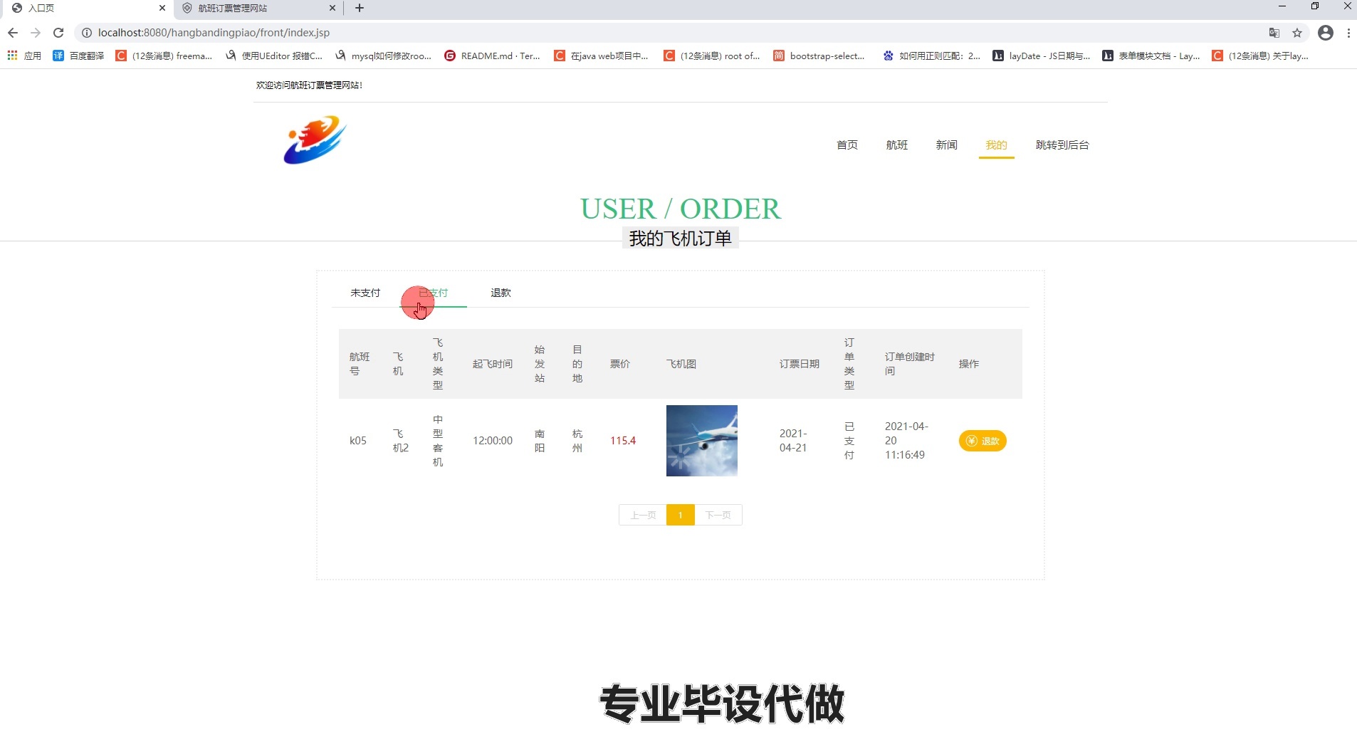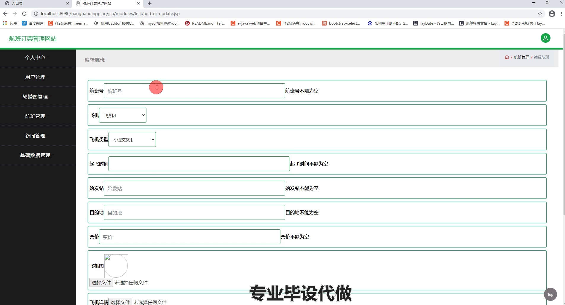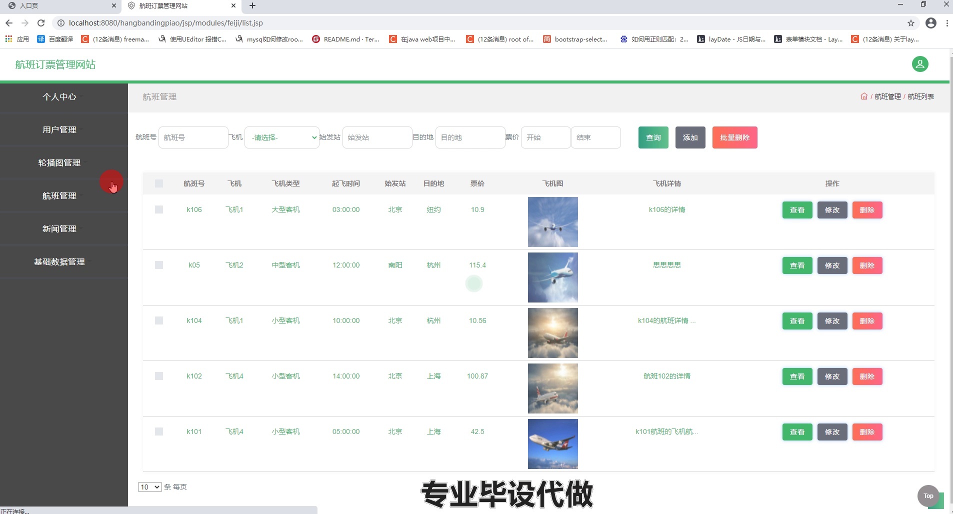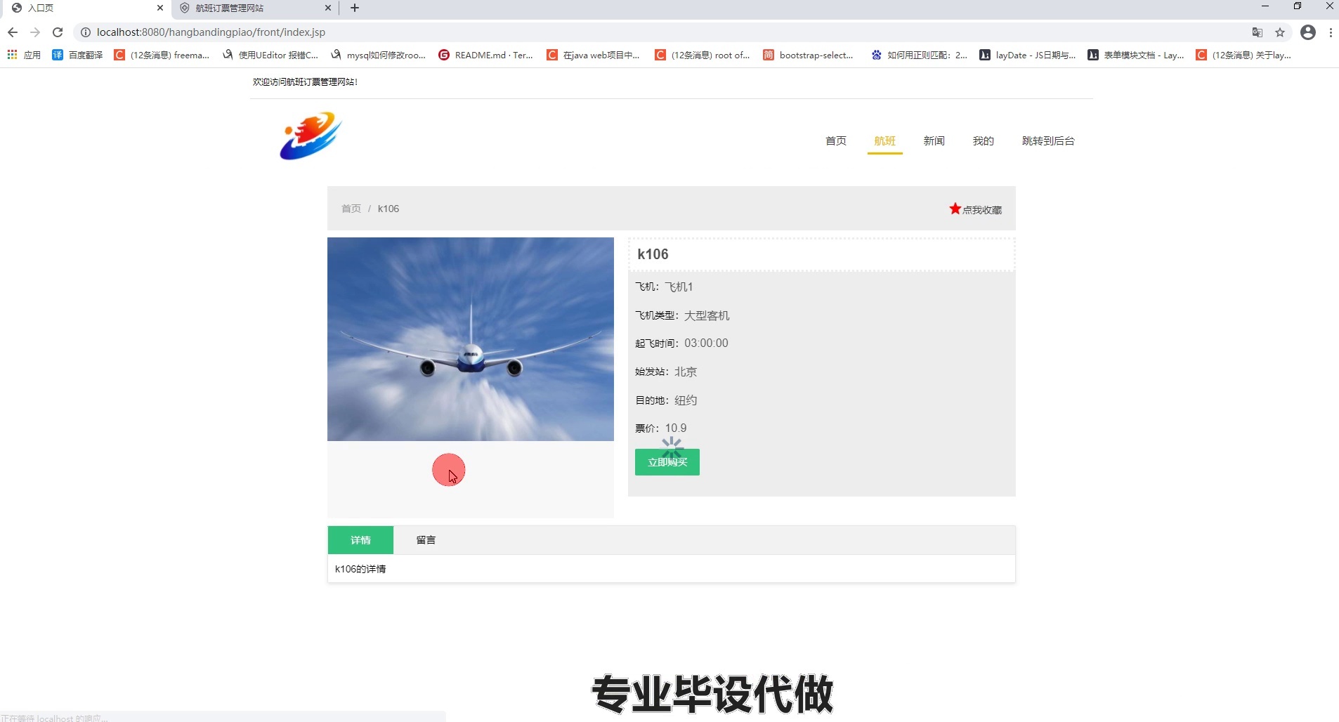 航班订票管理系统在Eclipse环境中,使用Java语言进行编码,使用Mysql创建数据表保存本系统产生的数据。系统可以提供信息显示和相应服务,其管理员管理飞机,管理用户,管理航班,管理新闻,回复用户留言,查看航班订单。用户查询航班,收藏航班,购买机票,查看航班订单以及新闻信息。