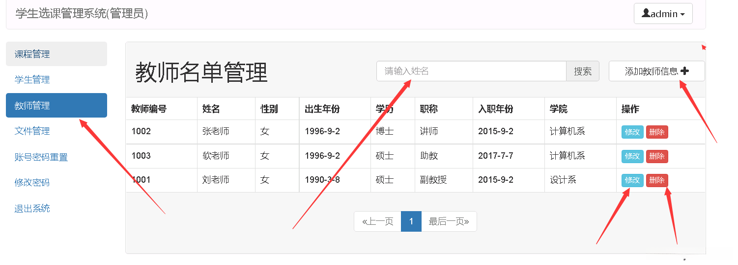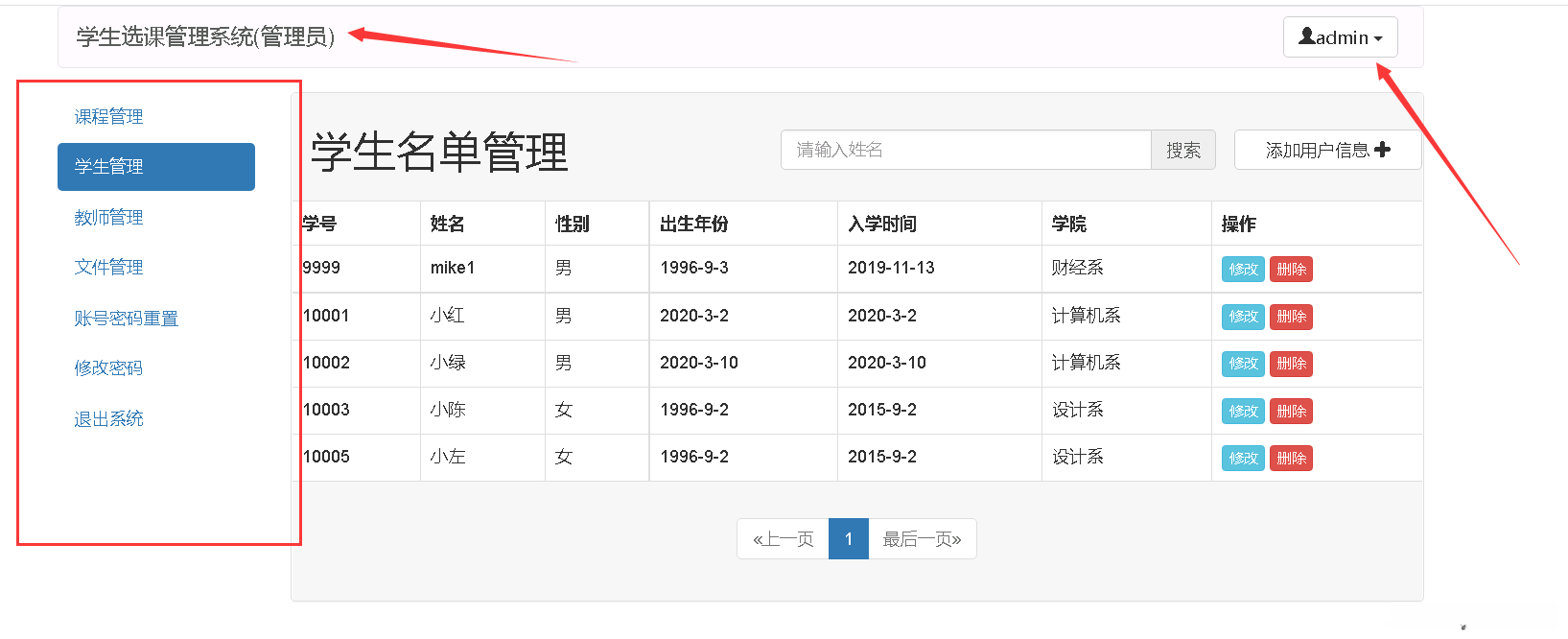 管理员可对 教师信息、学生信息、课程信息 进行 增删改查 操作,管理员账户,可以重置非管理员账户的密码。