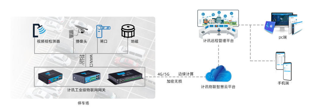 计讯智慧城市停车解决方案由三部分组成,分别是采集设备、网络传输设备、管理中心。